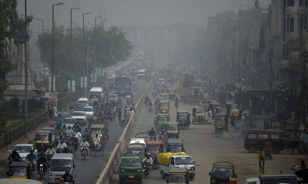 کراچی کی مصروف سڑکوں پر ٹریفک کا دباؤ مسلسل بڑھ رہا ہے ۔ اسی تناظر میں فضا میں دھواں بھی خطرناک حد تک بڑھ چکا ہے ۔ نتیجتاً، درجہ حرارت میں اضافہ ہو رہا ہے۔ مزید برآں شہری زندگی متاثر ہو رہی ہے ۔