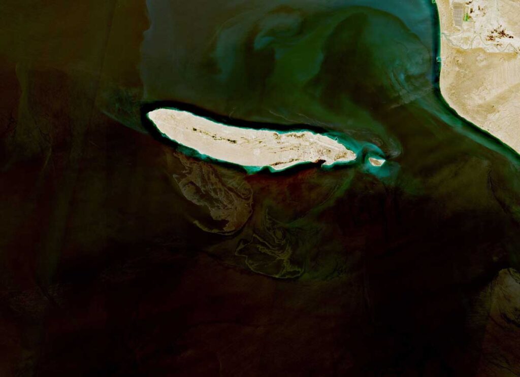 اسی دوران 7 اپریل کی ایک تصویر میں ایران کے جزیرہ قشم کے قریب آبنائے ہرمز میں پانچ میل سے زیادہ پھیلا ہوا تیل کا رساؤ دیکھا گیا۔
